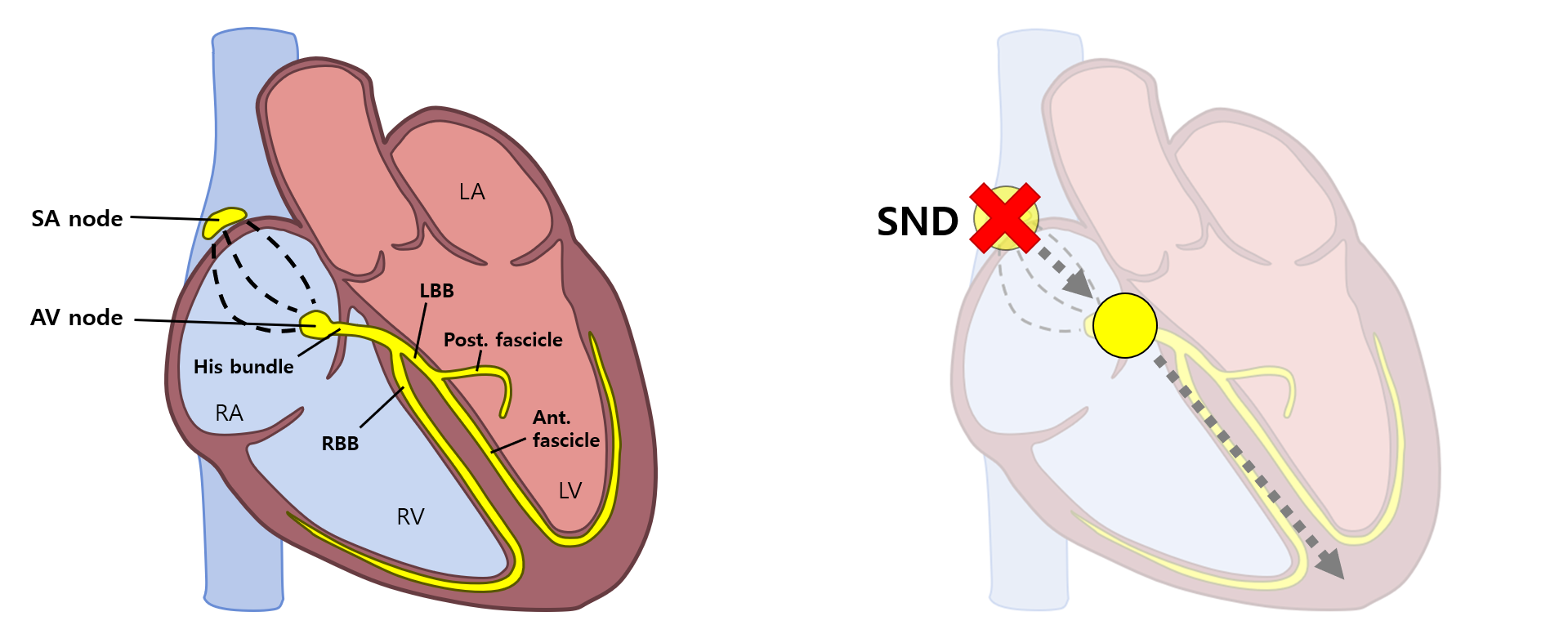 (1) 병태생리: SA node 신호가 심방 조직으로 전도되지 않음