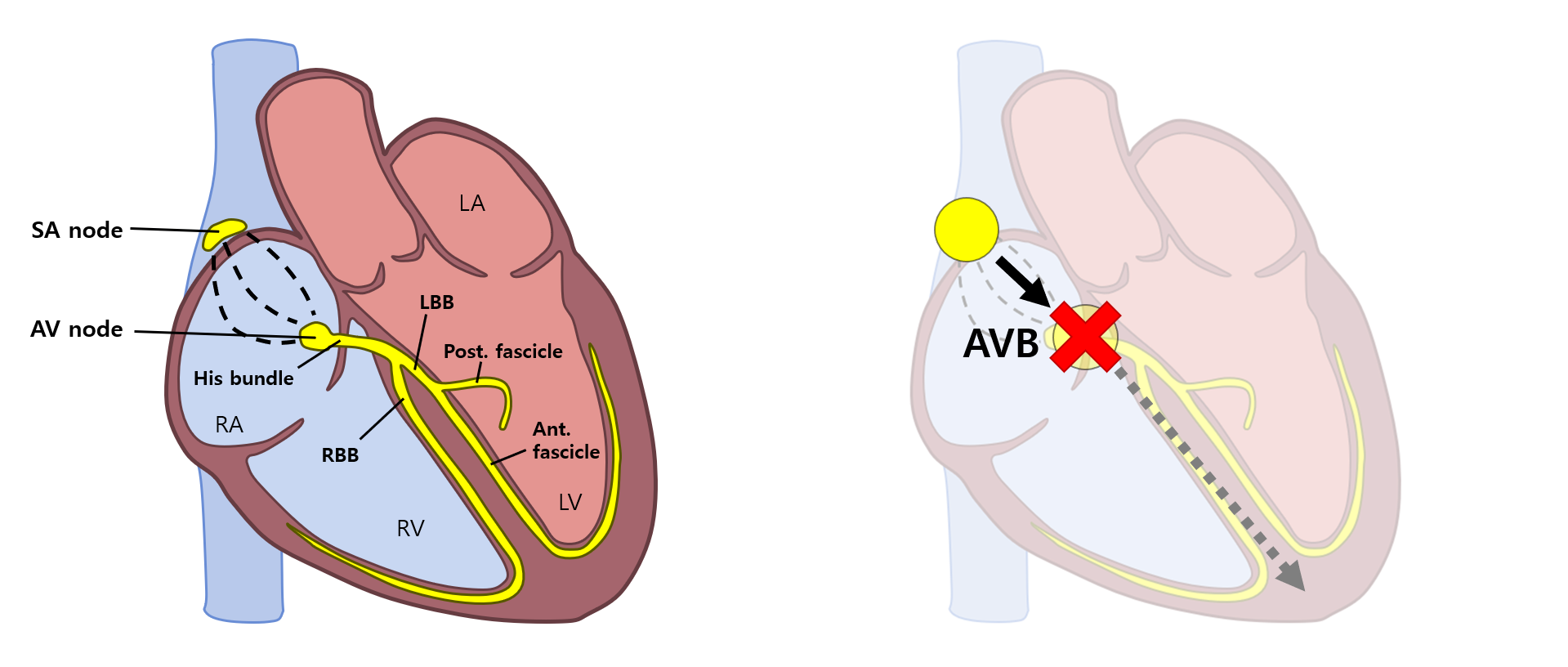 * AVB에서의 약물치료는 block의 위치가 AV node보다 밑, 즉 His 이하일 경우 큰 효과를 보기 어렵다.