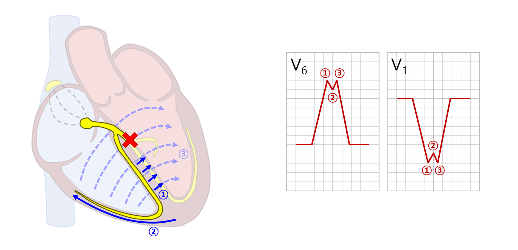 * Bundle branch를 타고 전달되어야하는 신호의 일부가 myocardium을 통해 느리게 전달되어 wide QRS가 나타난다.