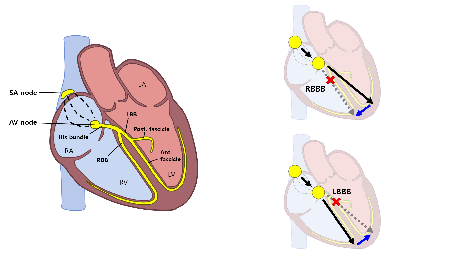 전도 장애 중 His-Purkinje system의 아래부분인 bundle branch에 이상이 발생할 경우 나타나는 질환이다. 독립적인 문제는 거의 출제되지 않지만, 다른 질환들과 연관되어 심전도 소견이 주어지는 경우가 있으므로 LBBB, RBBB의 심전도 소견을 익혀두어야 한다. 문제에서는 교과서적인 파형이 주어지지 않는 경우가 많으므로 각 파형의 특징들을 잘 알아두자.