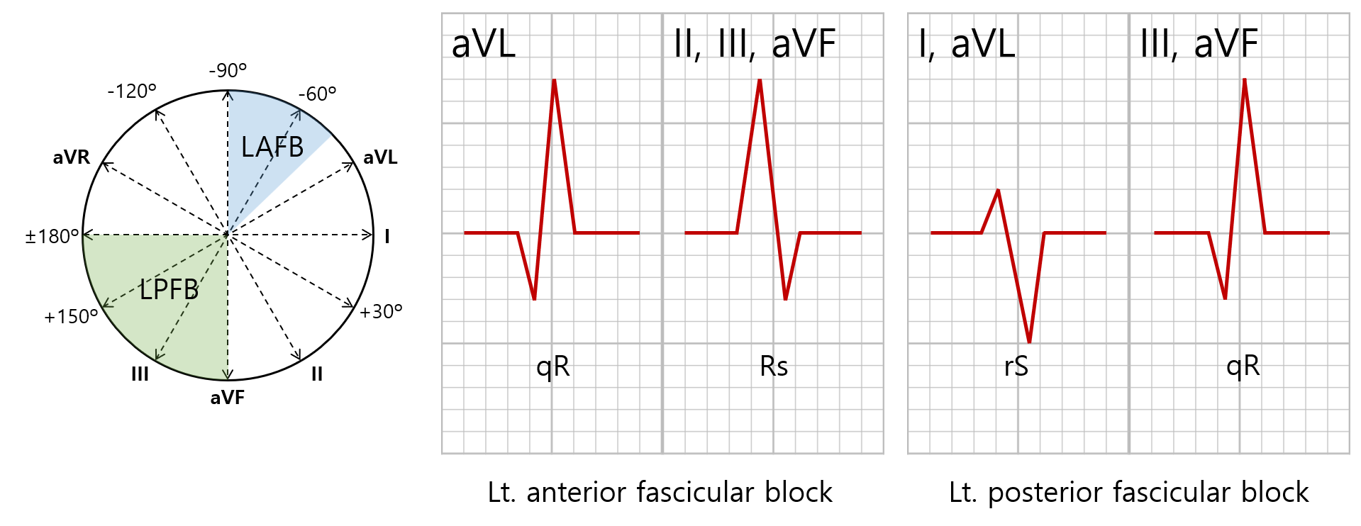 (1) 좌전섬유속차단(left anterior fascicular block, LAFB): LBB의 한 branch인 ant. fascicle이 차단됨