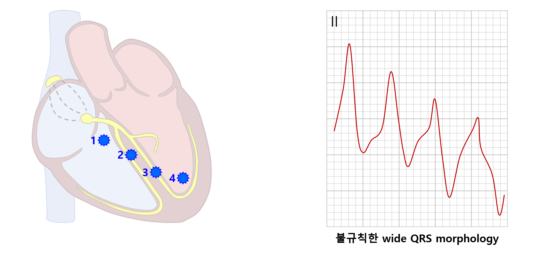① Atrial rate < ventricular rate(AV dissociation): 심실의 자체적인 전기신호 생산을 시사함