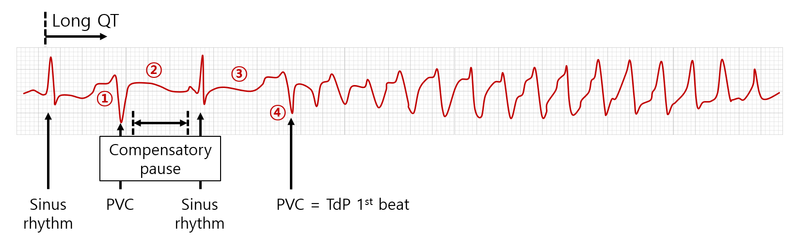 ④ ③에서 생성된 QT interval 중 PVC가 다시 발생 → TdP 시작