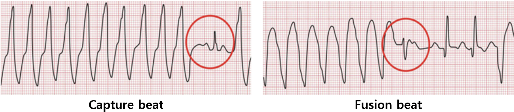 (2) Fusion beat: 심방에서 만들어진 신호와 심실에서 만들어진 신호가 합쳐진 형태
