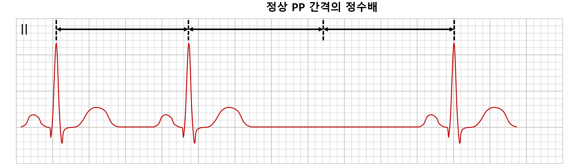 • SA node에서 생성된 자극 전도 X • P파, QRS군 모두 X •동정지 동안 PP간격이 정상 리듬 PP 간격의 정수배 | • 무증상: 경과관찰 • 증상: Pacemaker | |