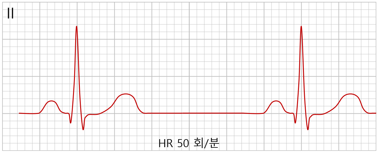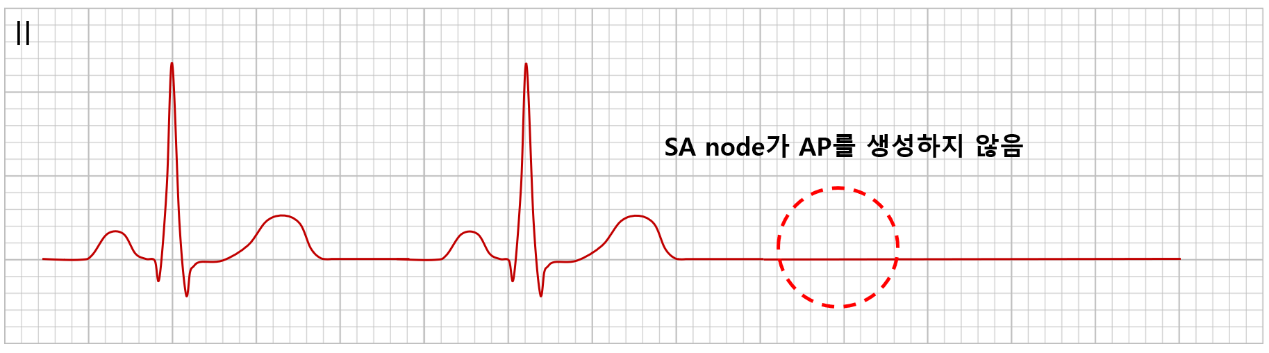 • SA node 자극 형성 X • P파, QRS군 모두 X • Escape beat • 동정지 동안 PP간격이 정상 PP 간격의 정수배가 아님 | • 무증상: 경과관찰 • 증상: Pacemaker | |