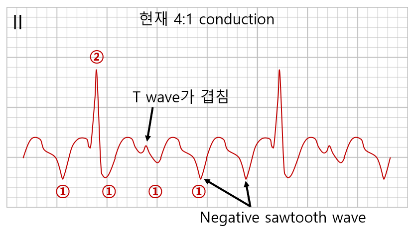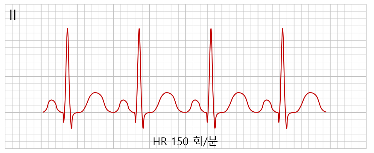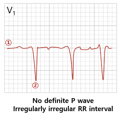 • No organized P wave • Irregularly irregular RR interval • Narrow QRS | • 혈역학적 불안정: DC cardioversion • Anticoagulation: CVS 2점 이상시 DOAC/warfarin • Rate control: BB, non-DHP CCB • Rhythm control: 항부정맥제(class IC/III), DC cardioversion, catheter ablation | |