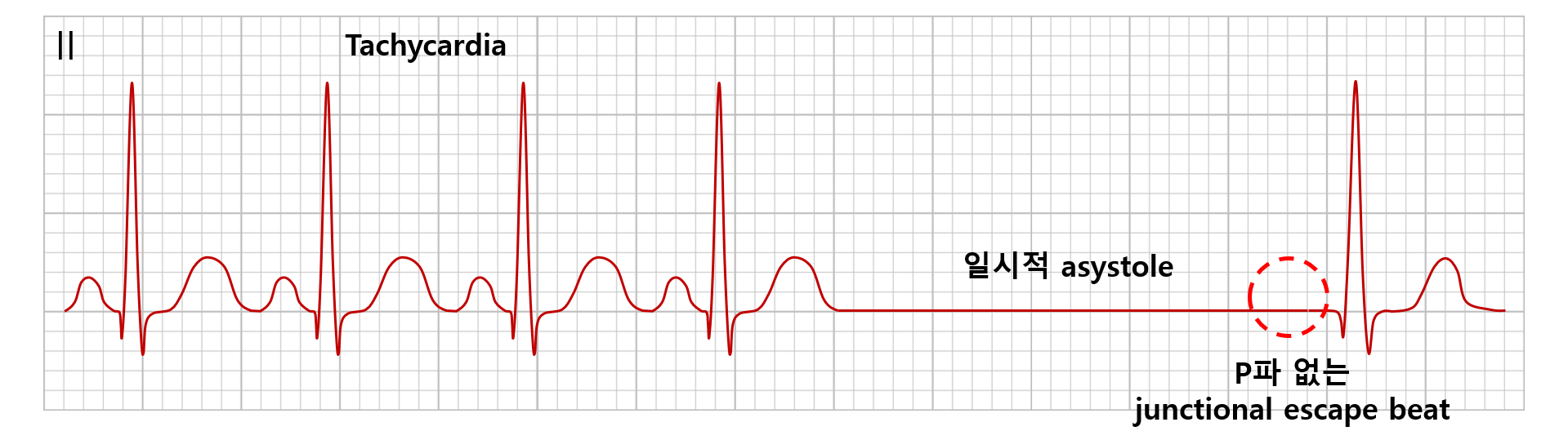 • 빈맥(AF 등) → sinus pause • 이후 junctional escape beat | • 동반 부정맥 치료 • 서맥 증상: Pacemaker | |
