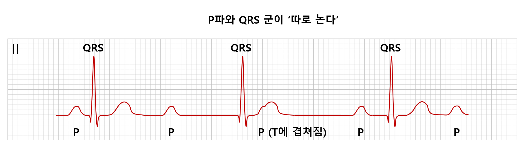 • P파와 QRS 군이 분리되어 독립적으로 생성 • Escape beat에 의해 심실 수축 | • 증상 관계없이 영구적 pacemaker | |