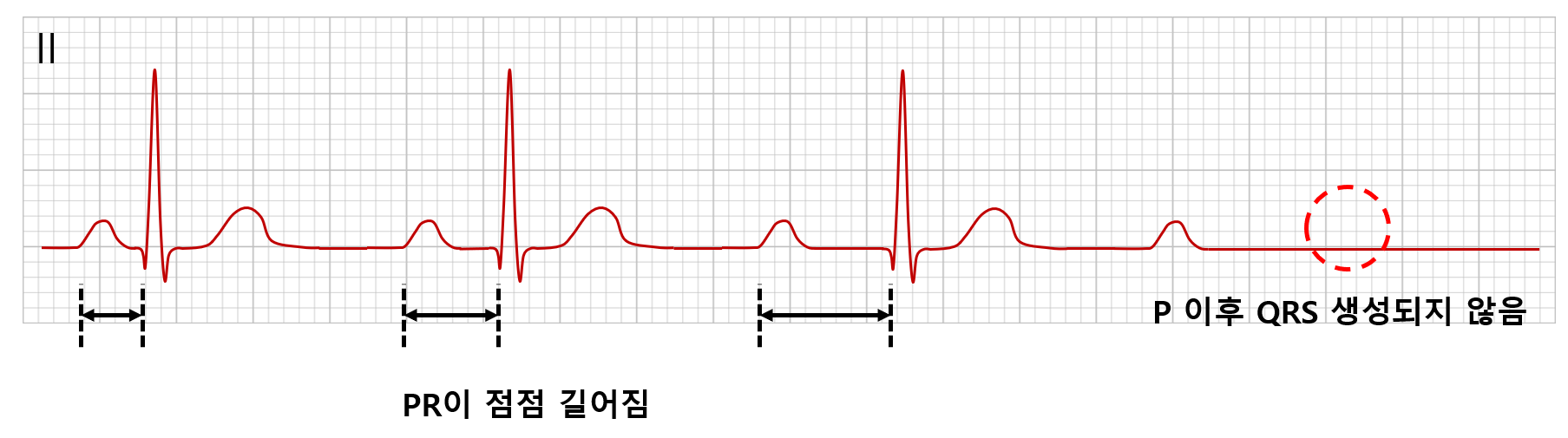• PR 간격 점점 길어지다 전도 차단 | • 무증상: 경과관찰 • 증상: Pacemaker | |