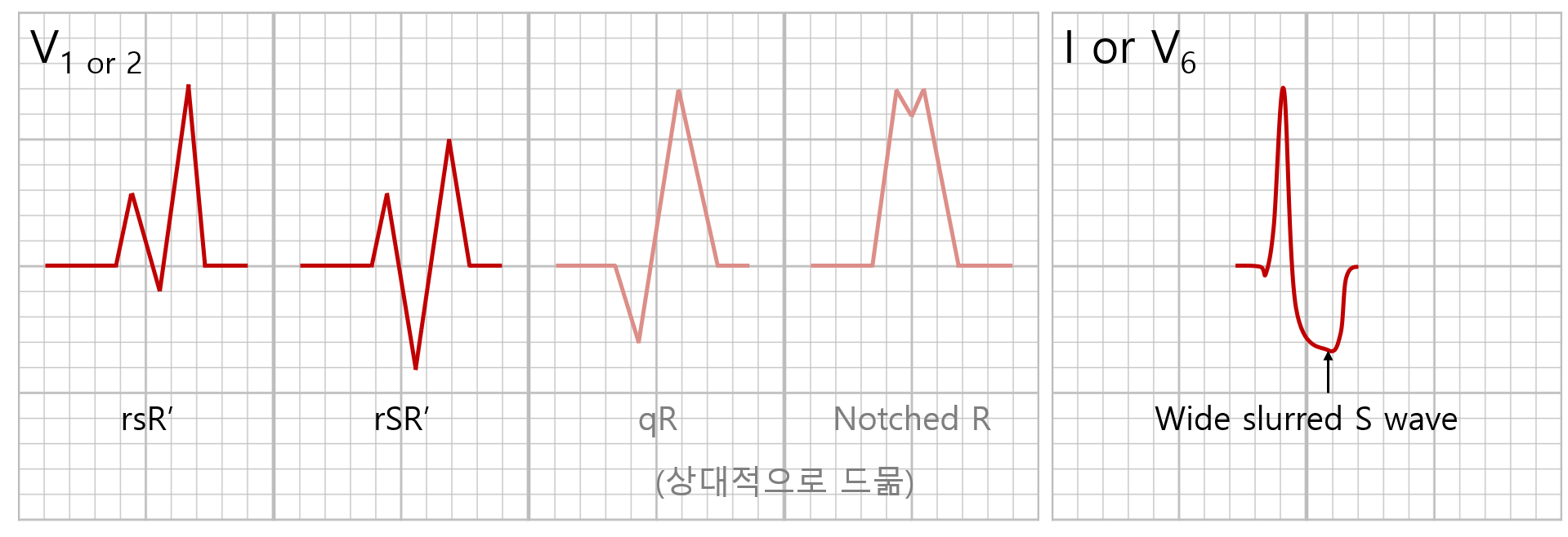 • V1의 rsR', rSR' • V6의 qRS + wide/slurred S wave | • 무증상 + 동반질환 없을 시 경과관찰 | |