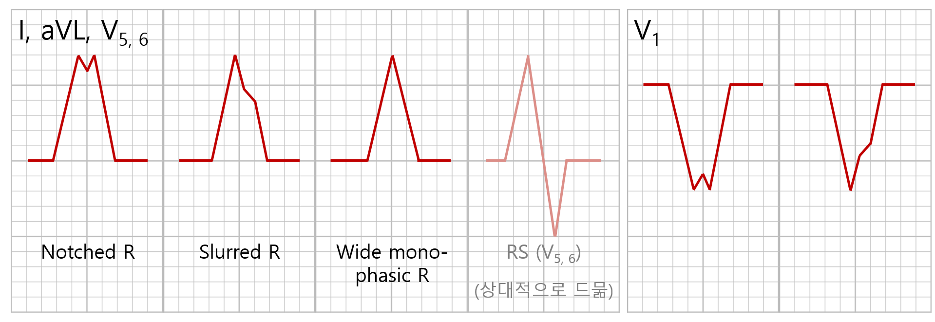 • V1: Notched/slurred QS • V6: Notched/slurred R | • LBBB: 심초음파 (구조적 이상 동반 가능) | |