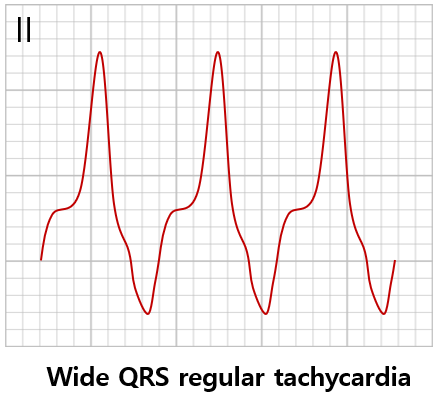 • Wide QRS tachycardia • Regular RR interval | • Monomorphic VT: DC cardioversion or amiodarone • Polymorphic VT: Defibrillation, amiodarone • 예방: ICD, BB, catheter ablation | |