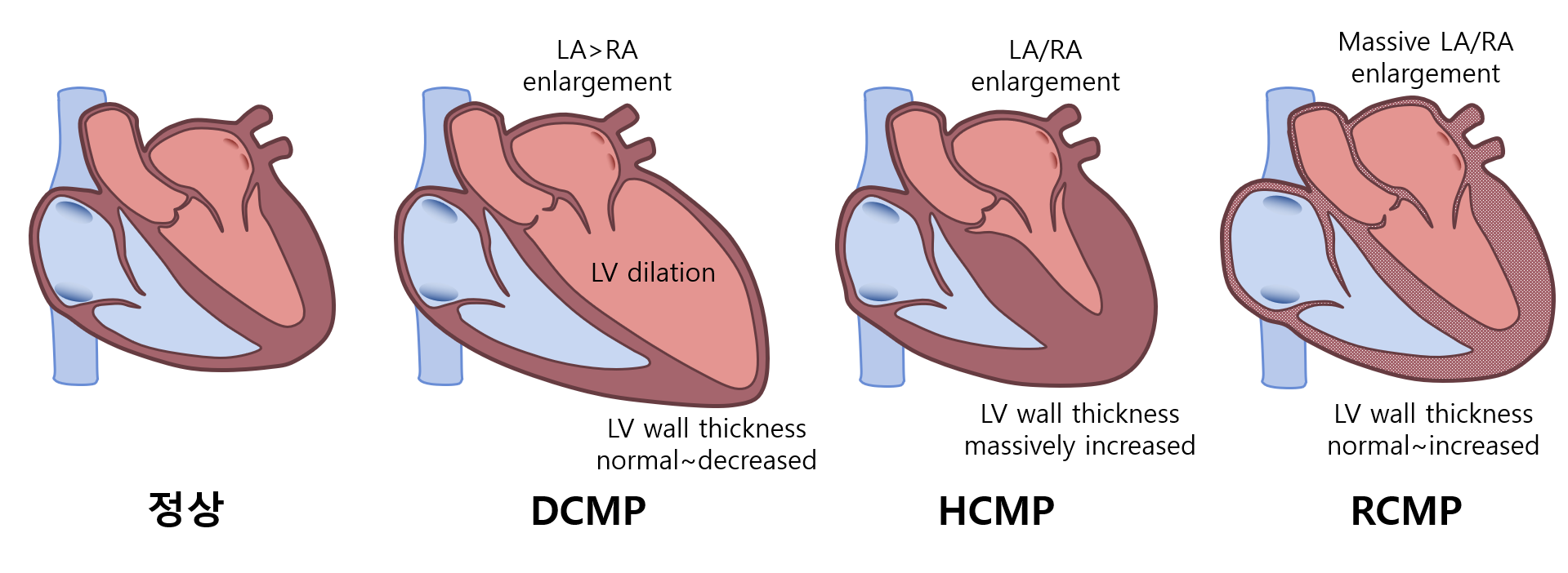* 위 표는 대략적인 분류이며, 각 환자마다 질병의 원인이나 진행 상태에 따라 다를 수 있다. 특히 DCMP의 경우 LV dilation이 없는 non-dilated LV cardiomyopathy라는 소분류도 존재한다.