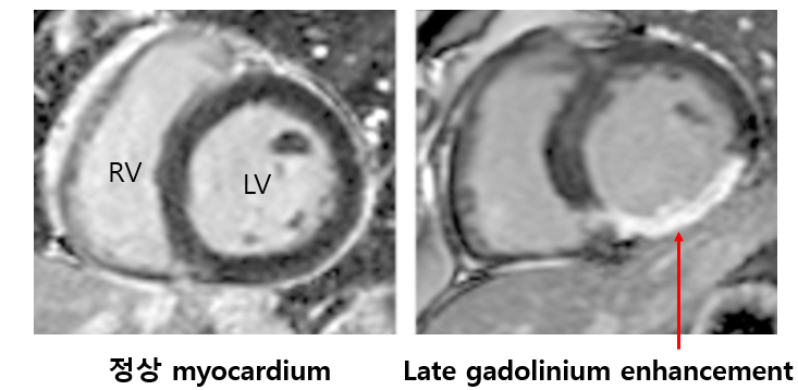 (3) 조영증강 심장 MRI: T1/T2의 signal, gadolinium 조영제의 증강 패턴(late gadolinium enhancement)을 분석해 원인 질환 파악