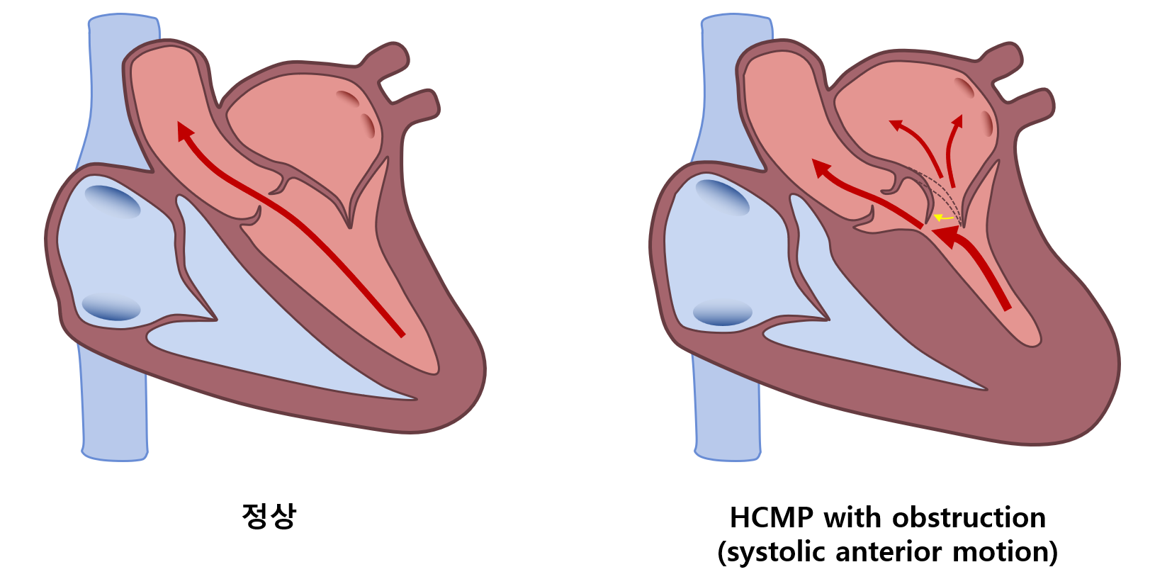 * 위 과정을 systolic anterior motion(SAM)이라고 지칭한다. 모든 HCMP 환자에 LVOTO가 발생하는 것은 아니다. LVOTO가 있는 HCMP(약 2/3)를 HCMP with obstruction이라고 하며, 반대로 없는 나머지(1/3)를 HCMP without obstruction이라고 지칭한다.