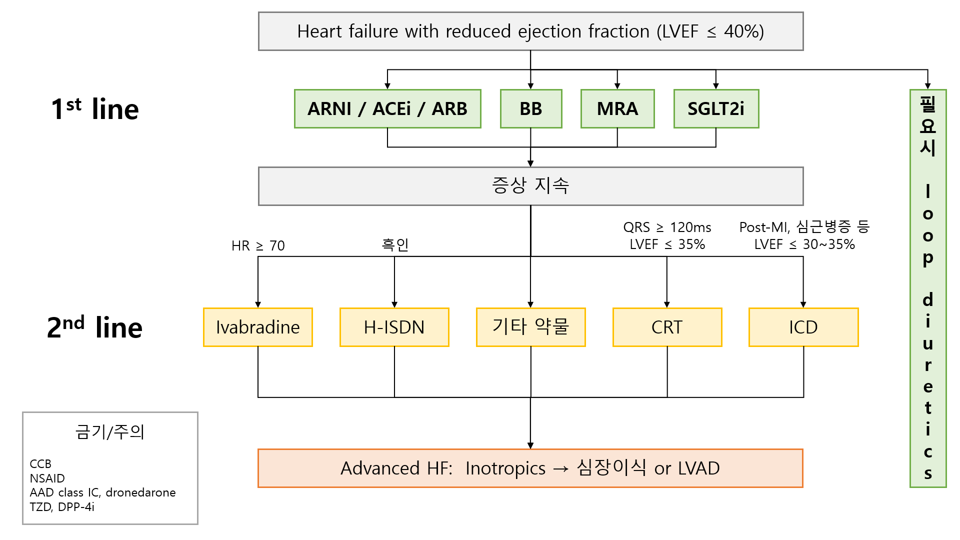 HFrEF 치료 (LVEF ≤ 40%) | 1차 치료: ARNI/ACEi/ARB, BB, MRA, SGLT2i, loop diuretics(필요시) 기타: Ivabradine(HR ≥ 70), H-ISDN(흑인), CRT(wide QRS), ICD(post-MI 등) |