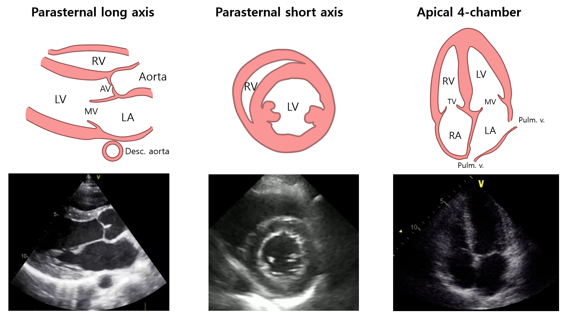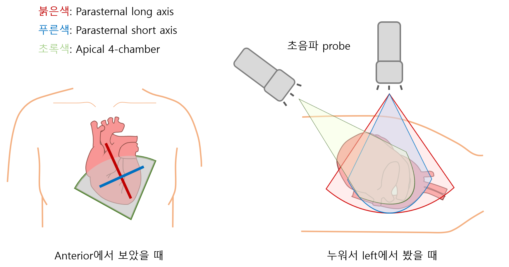 ① 경흉부심초음파(transthoracic echocardiography, TTE): 가장 흔히 사용되는 방식. 위의 모든 window는 TTE 기반