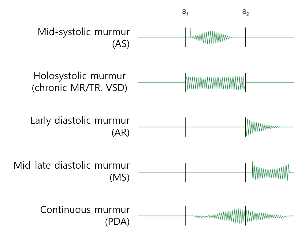 (2) 이완기 심잡음: S2 후에 시작해 S1 전에 끝남 - 거의 무조건 이상소견