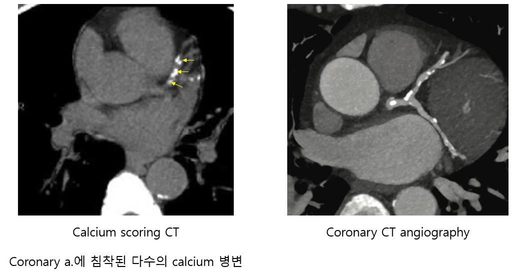 ② 관상동맥질환 발병 위험을 어느 정도 예측할 수 있으나, calcium이 없는 atherosclerotic plaque도 있음