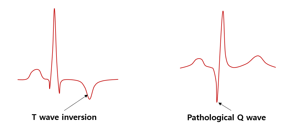 2) T wave inversion, pathological Q wave: ST depression/elevation이 발생하고 수 시간 ~ 수 일 후 발생