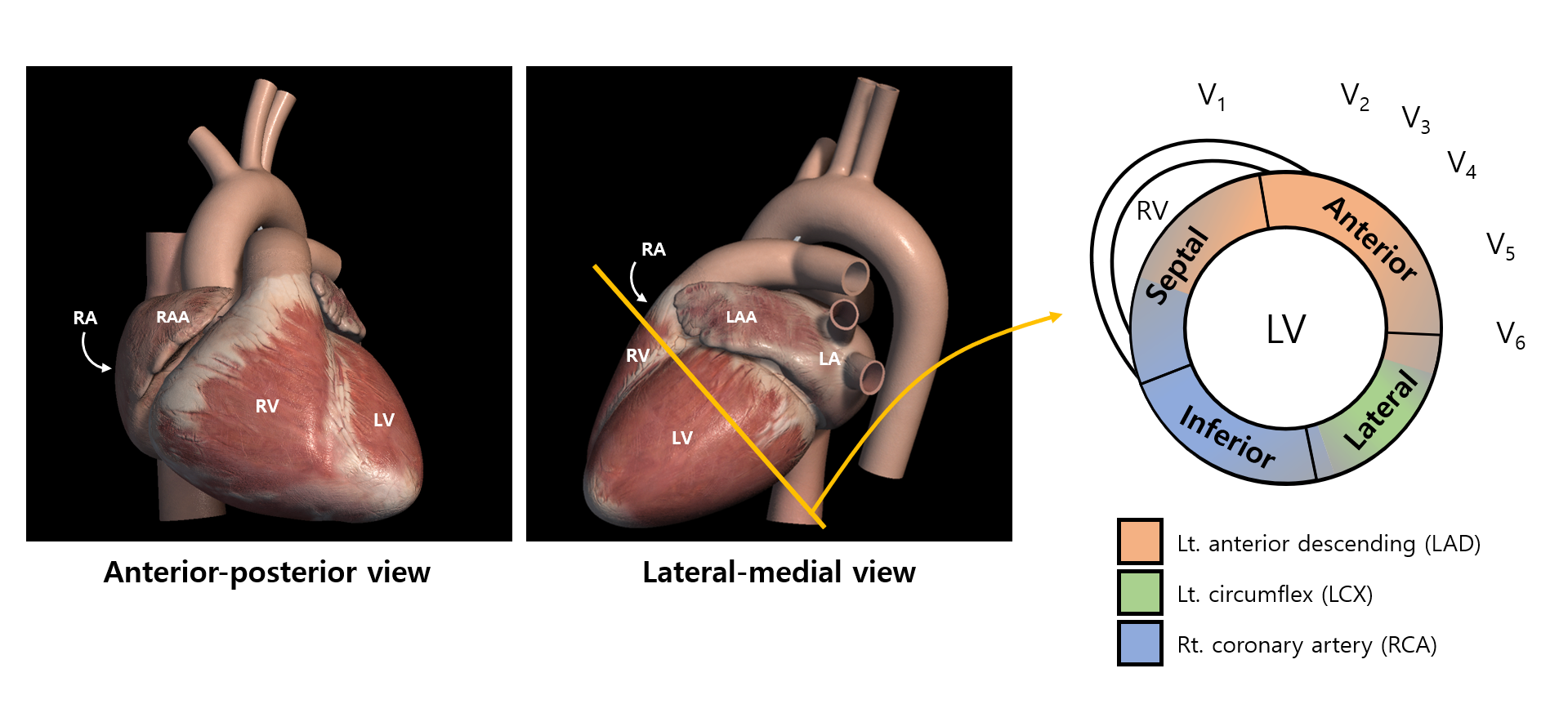 ③ Anterior~septal wall은 LAD에, lateral wall은 LCX에, inferior~septal wall은 RCA에 의해 관류됨