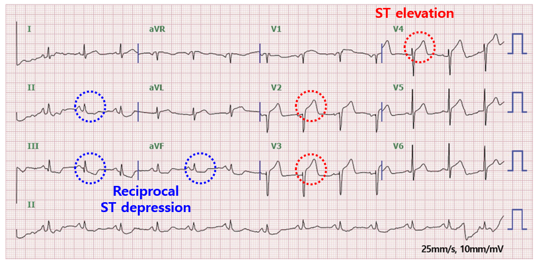 • ST elevation과 반대쪽 lead의 reciprocal change가 같이 관찰됨