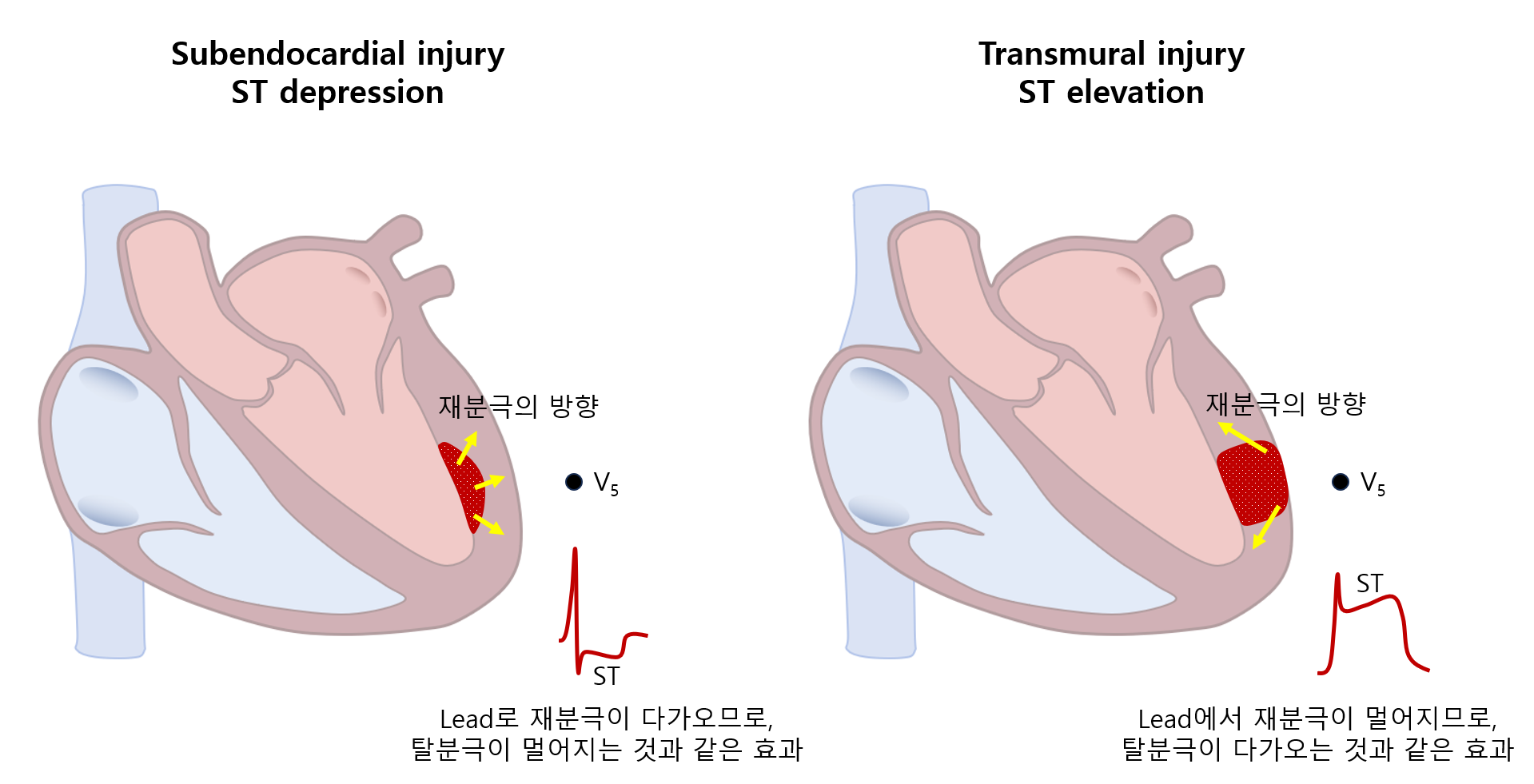 ② Lead에서 보았을 때 재분극이 멀어지므로, 탈분극이 다가오는 것과 같은 효과 → ST elevation
