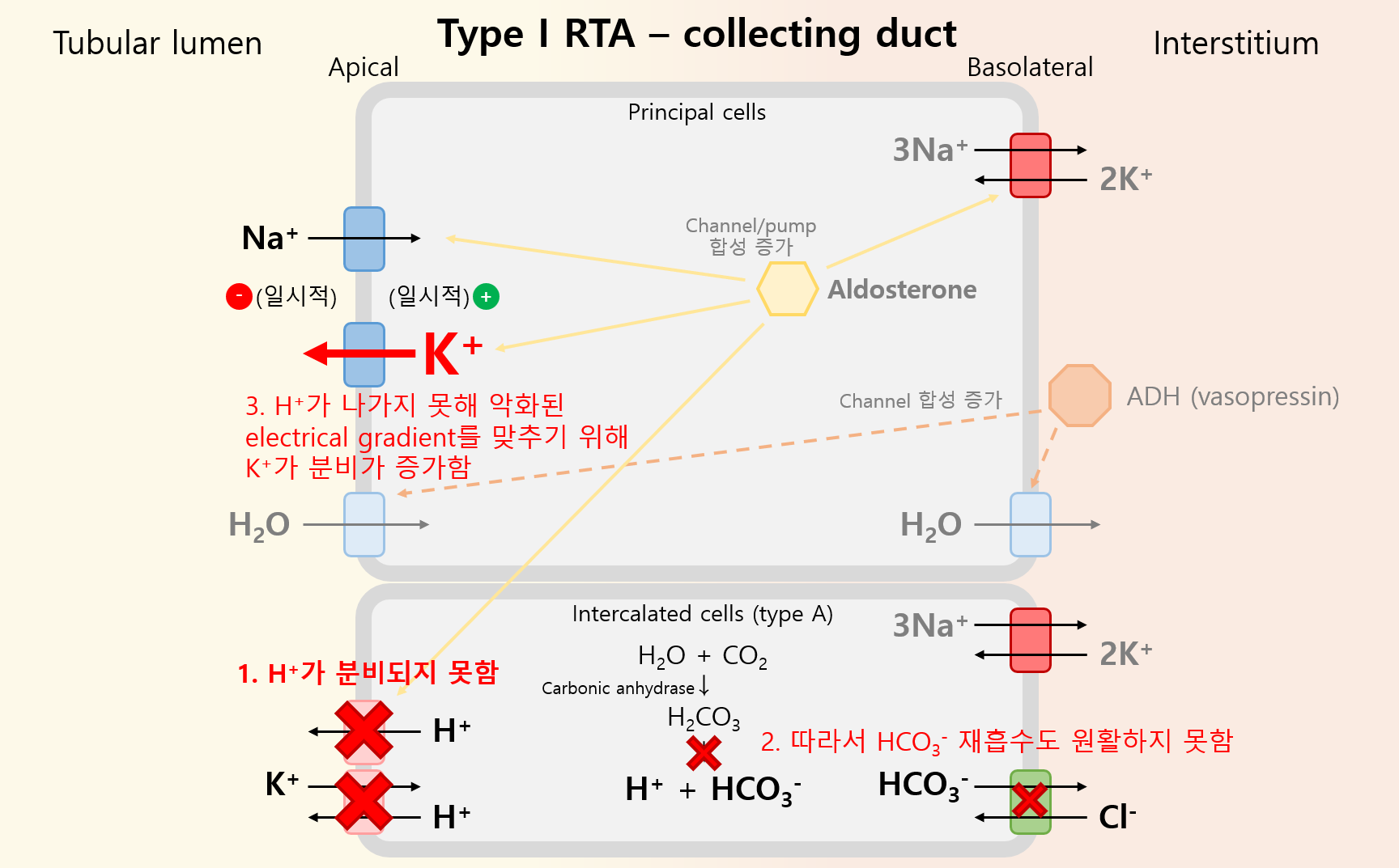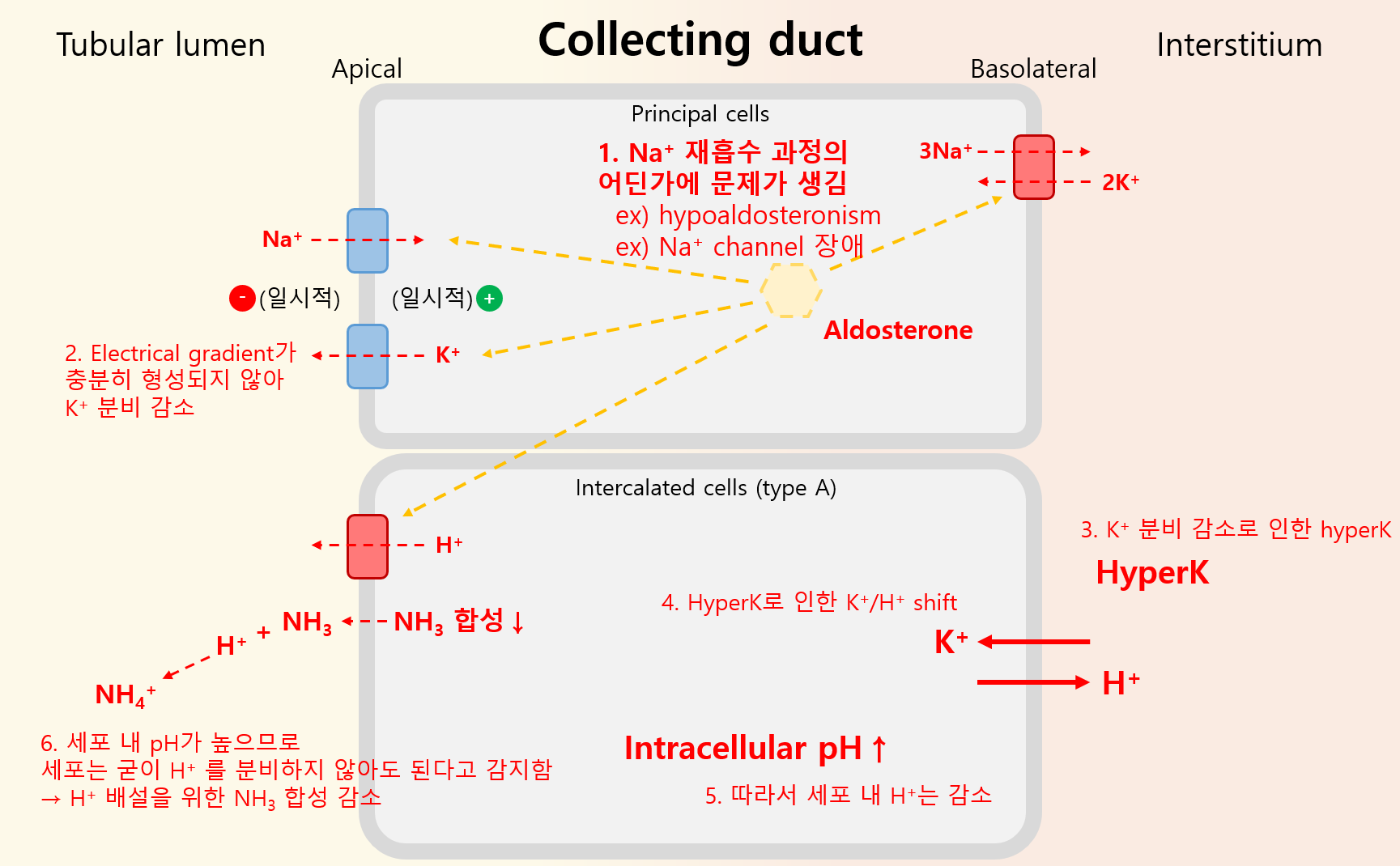 (1) 병태생리: Collecting duct의 Na+ 재흡수 이상 → H+, K+ 배설 이상