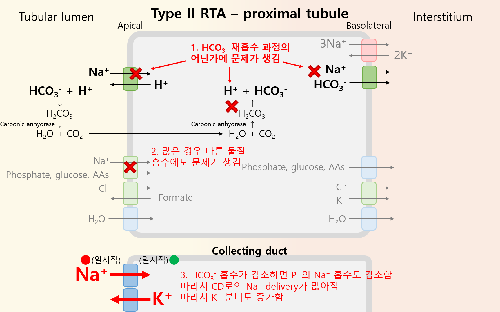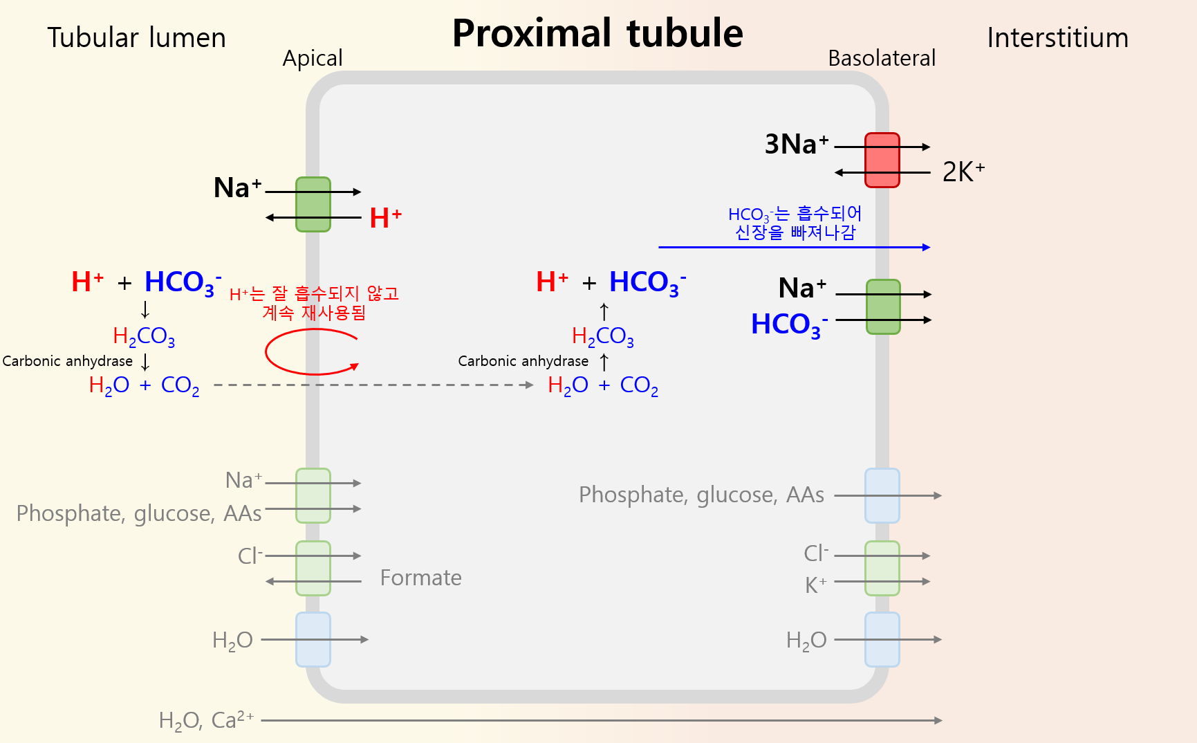 ① PT: H+와 결합해 H2CO3 형태로 세포 내로 유입되어 다시 분리, Na+/HCO3- cotransporter에 의해 흡수됨
