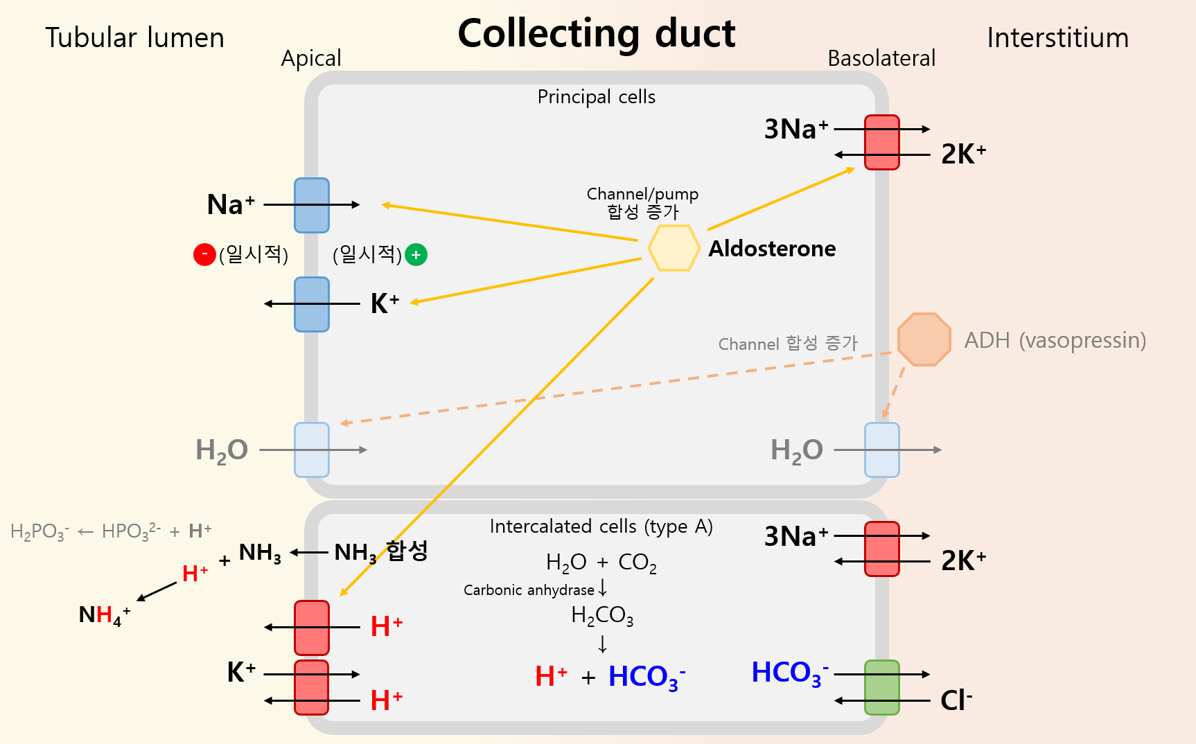 ② CD: H2CO3 상태에서 분리, Cl-/HCO3- exchanger의 영향에 의해 흡수됨