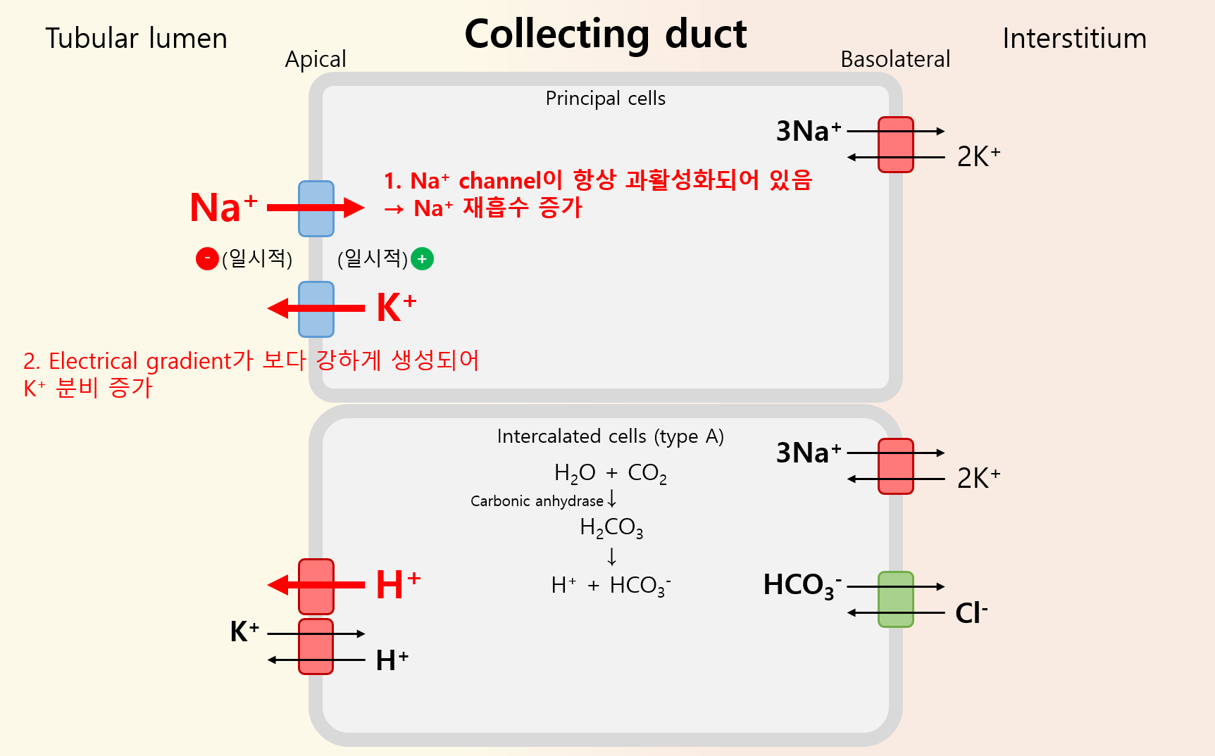 (3) Collecting duct에서 Na+가 대신 대량으로 흡수되며 K+ 분비도 증가 → hypoK