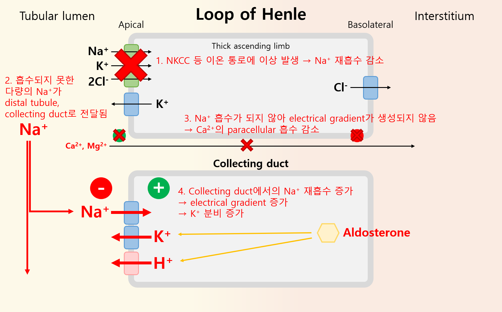 병태생리 | LoH의 이온통로 억제 (ex. NCC) | DT의 NCC 억제 | CD의 ENaC 과활성화 |
