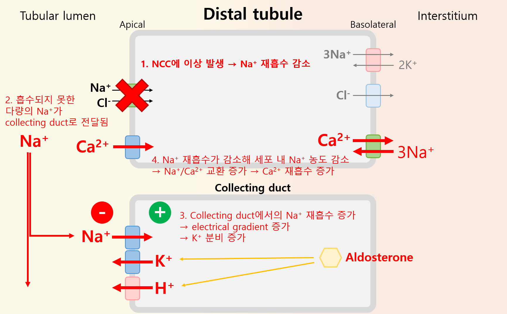 (3) 또한, distal tubule 세포 내 Na+ 농도가 감소해 basolateral Na+/Ca2+ 교환 증가 → hypocalciuria