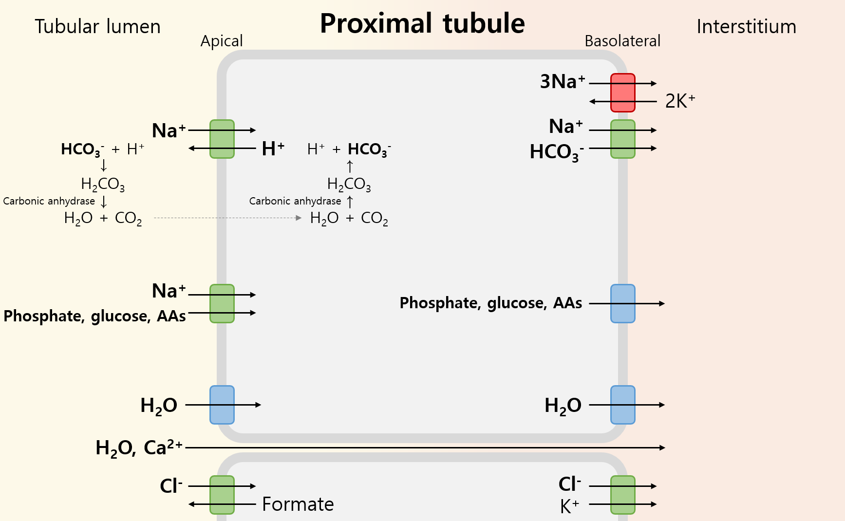 HCO3- | ① 분비된 H+가 HCO3-와 tubular lumen에서 H2CO3로 결합 ② Carbonic anhydrase(CA)에 의해 H2O + CO2로 분리 ③ CO2는 nonpolar하므로 세포 내부로 확산 ④ H2O와 함께 CA에 의해 다시 H2CO3로 재결합 → H+ + HCO3-로 분리 |