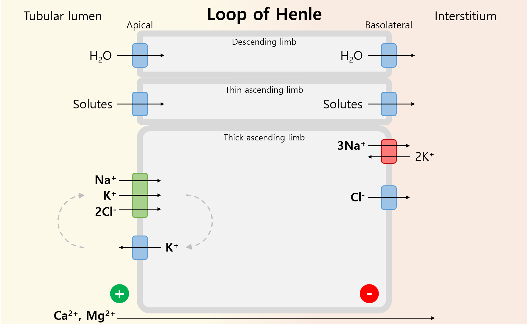 Ca2+/Mg2+ | ① Apical에서 K+가 분비되며 tubular lumen은 (+), 다른 곳은 (-) 전하를 띠게 됨 ② Electrical gradient에 따라 양이온인 Ca2+/Mg2+가 paracellular하게 interstitium으로 이동 |