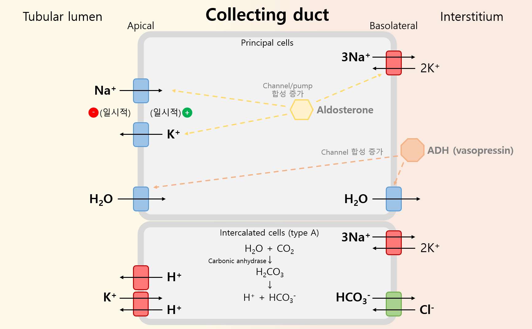① Principal cells: Na+ 재흡수/K+ 분비 조절(aldosterone), H2O 재흡수 조절(ADH)