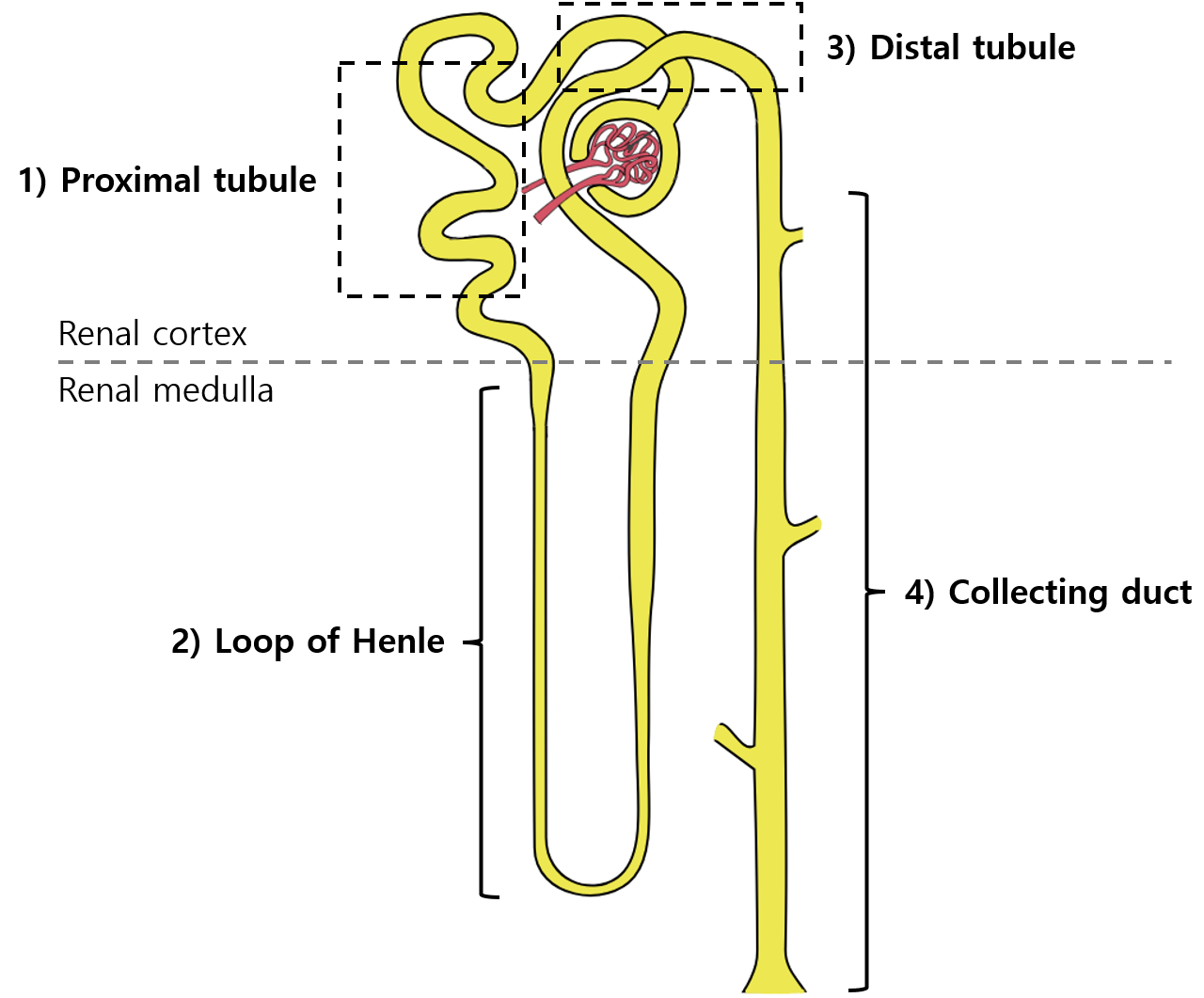 H2O | ① Loop of Henle 이후로 H2O는 흡수되지 못함 → lumen은 hypotonic, interstitium은 hypertonic ② H2O channel(aquaporin)을 통해 흡수 (ADH에 의해 항진) |
