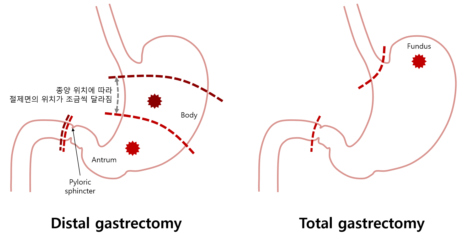 * Sabiston 21e p.1225, 대한위암학회 가이드라인(2022)에서 직접적으로 antrum과 body를 포함하는 distal stomach는 DG, fundus와 cardia를 포함하는 proximal stomach는 TG를 시행할 것을 명시하고 있다.