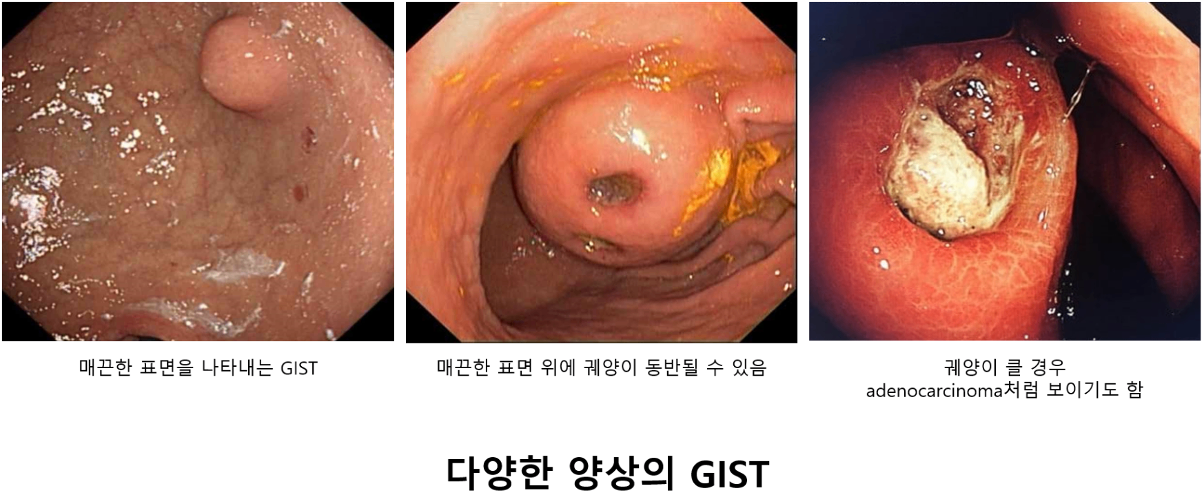 * GIST는 mucosa 아래 위치하고 있으므로 EGD 중 일반적으로 시행하는 조직검사(forceps biopsy)의 yield가 낮다.