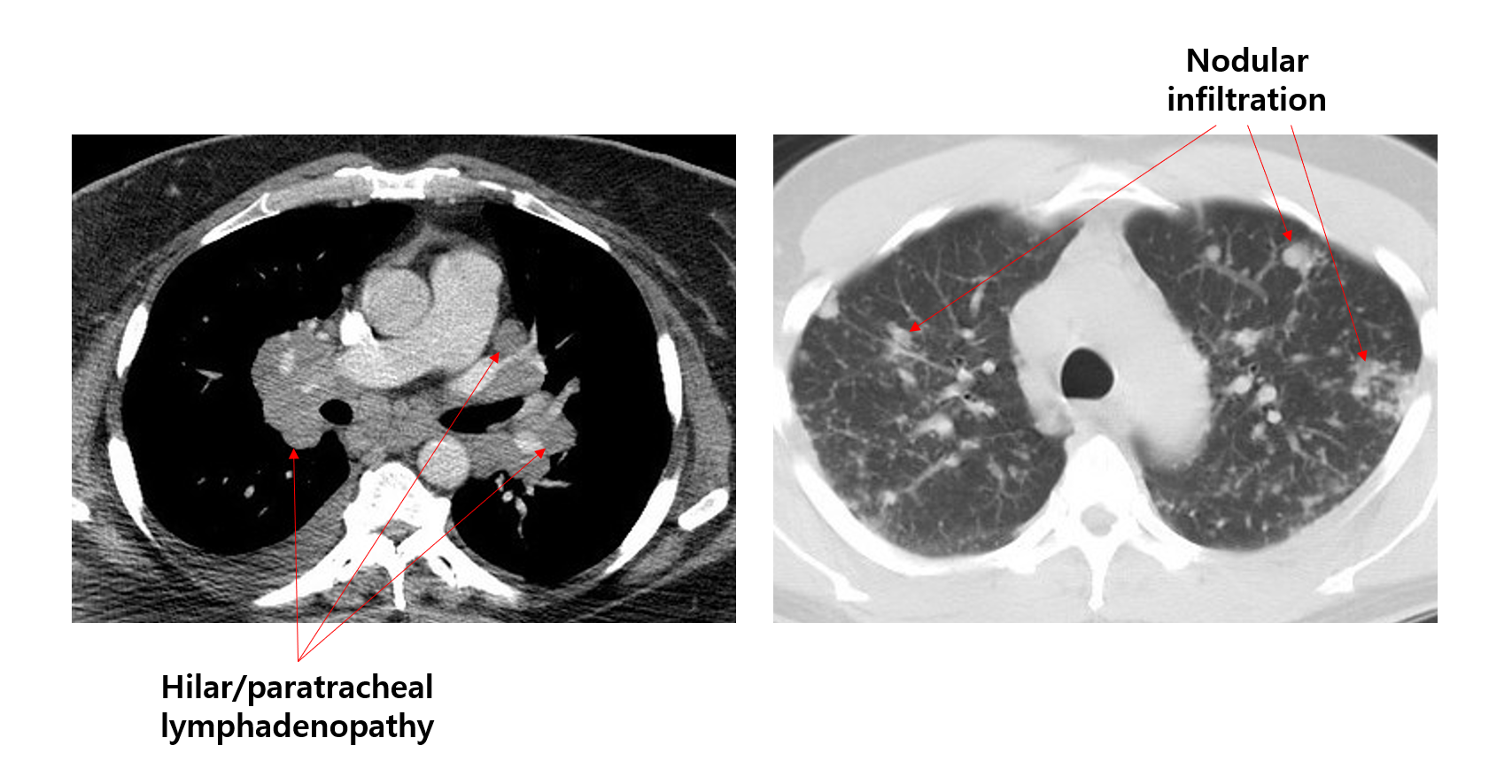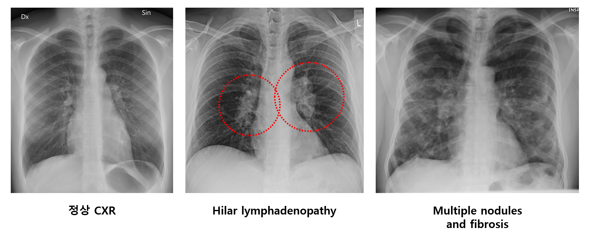 검사소견 | • HyperCa, ACE↑ • CXR: Hilar/mediastinal LN 비대 |