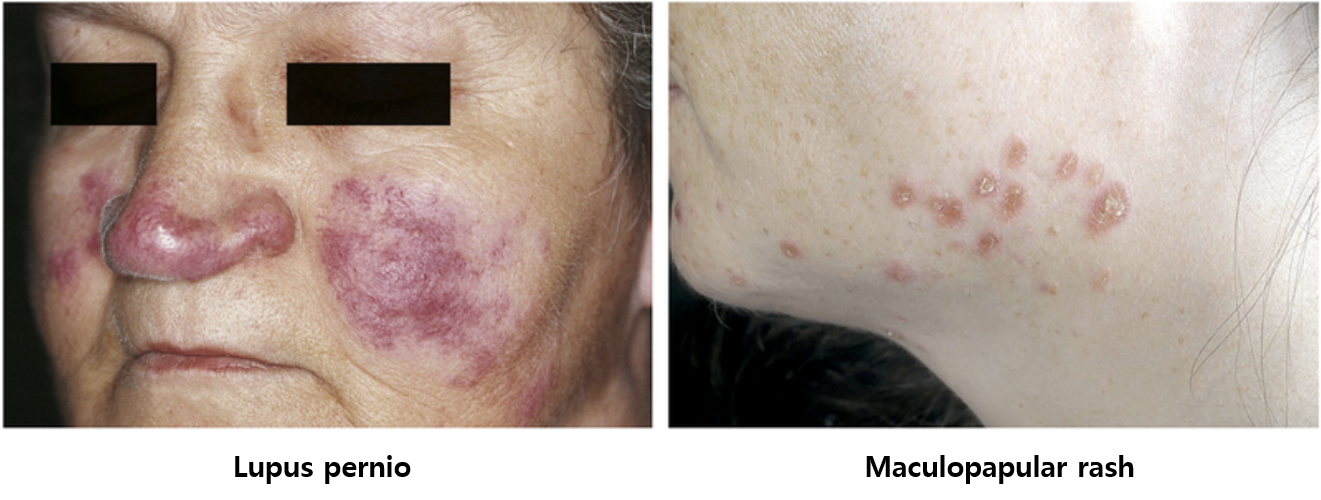 (2) Lupus pernio: 눈 아래, 콧등, 뺨의 특징적 피부병변