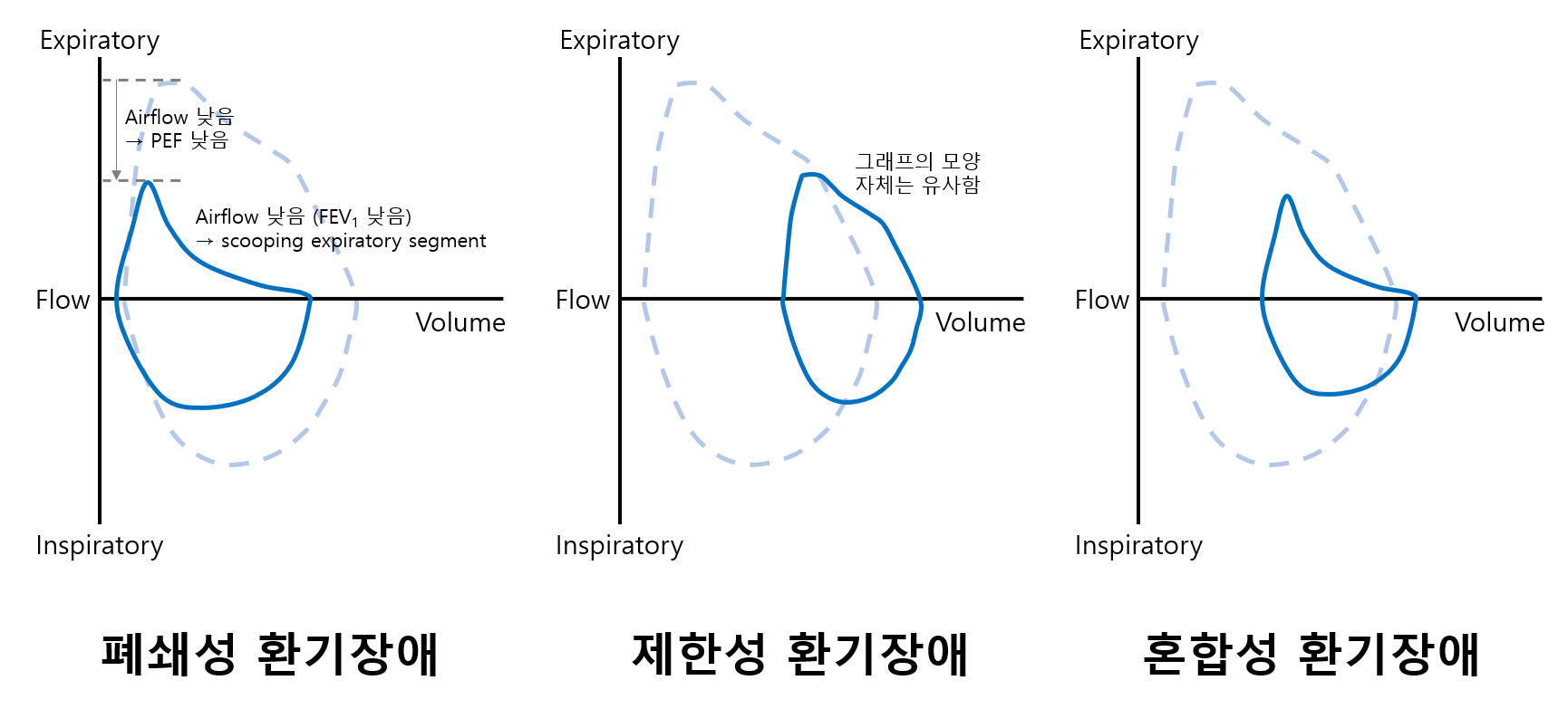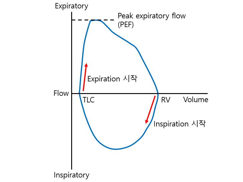* TLC: 폐 총 용적 / RV: 잔기량 / PEF: 최대호기유속 (최고점 높이)