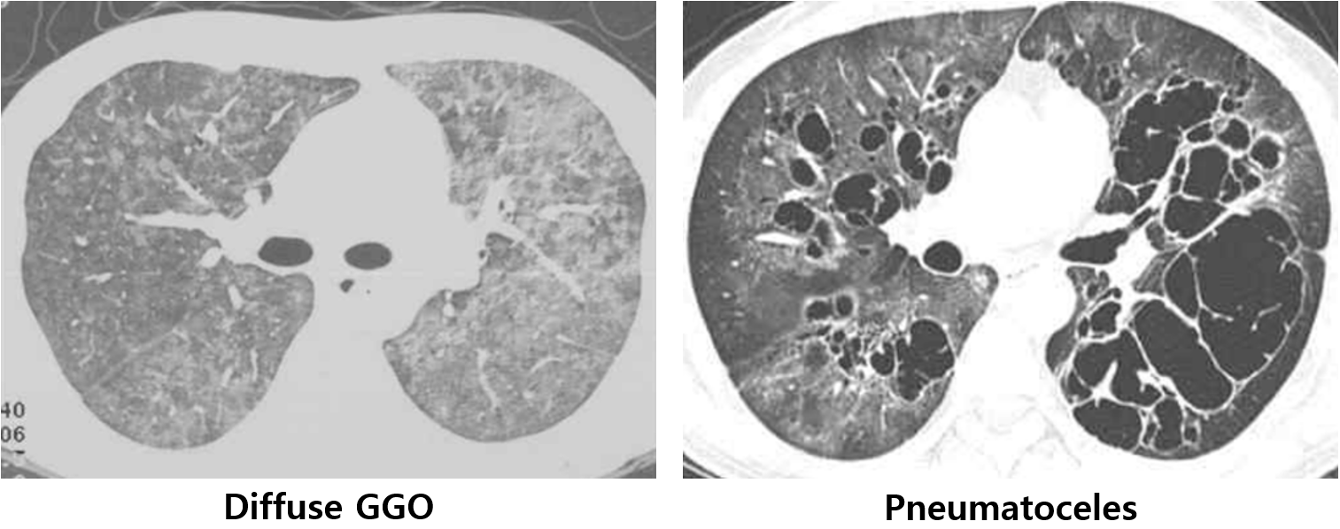 (2) 영상검사: Diffuse GGO → 공기집(pneumatocele) 형성