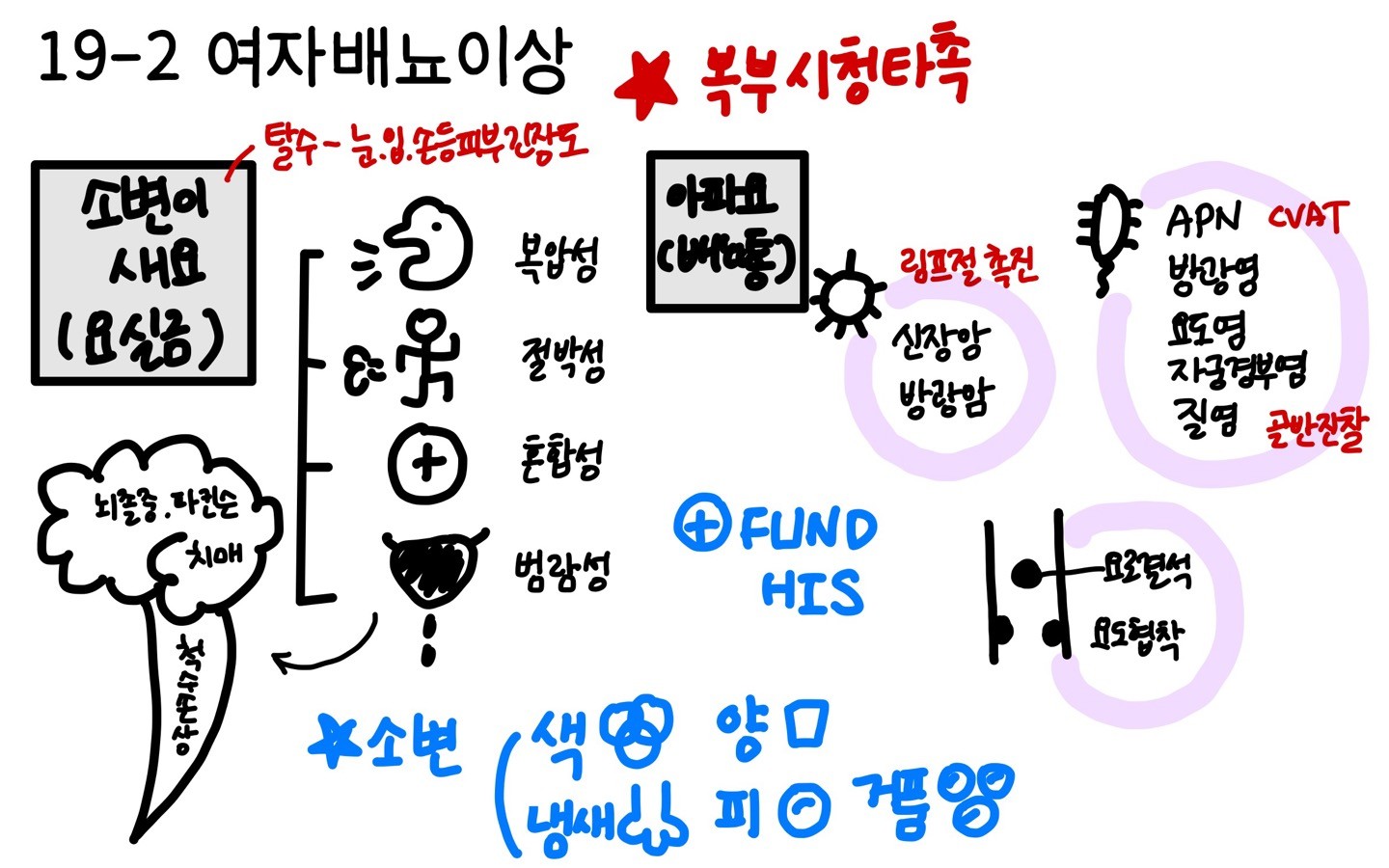 ② 배뇨통 : 암(신장암/방광암), 감염(APN, 방광염, 요도염, 자궁경부염, 질염), 물리적(요로결석, 요도협착)