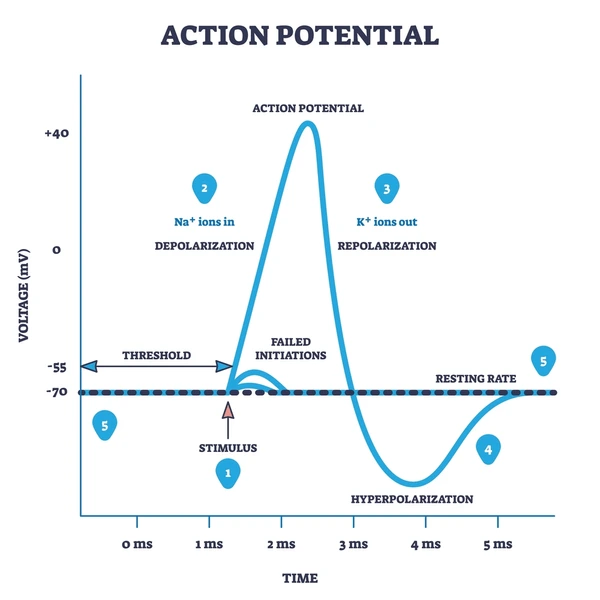 3) 역치전위(threshold potential): 약 -55mV (전압의존성 Na⁺ 채널 개방 시작)