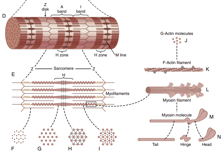 H-대(H zone) | 미오신 필라멘트만 존재 | 수축 시 길이 감소 |