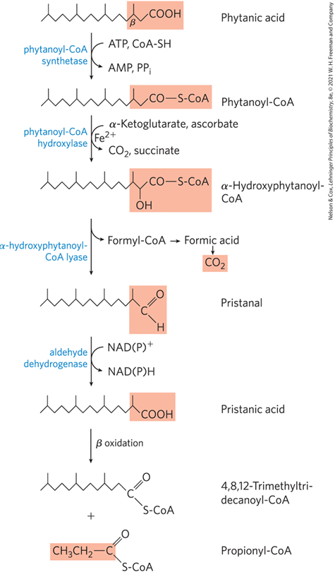 ① ATP를 소모해 Phytanic acid에 CoA 부착 (Phytanoyl-CoA synthetase) ② α 탄소에 하이드록시기 부착 (Phytanoyl-CoA hydroxylase) ③ 끝에 문제의 탄소 CO2로 제거 (Lyase) ④ aldehyde를 다시 지방산 형태로 변형 (aldehyde dehydrogenase) ⑤ β-Oxidation 진행 |