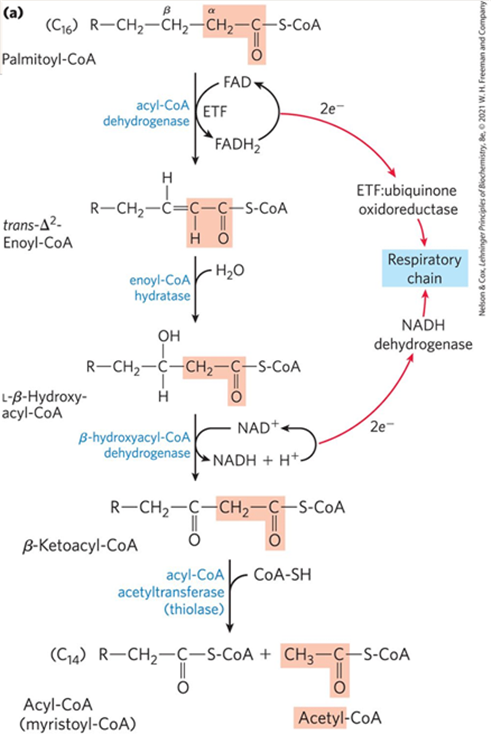 ① 탈수소 반응: trans 이중결합 생성 Fatty acyl-CoA → trans-Δ2-Enoyl-CoA (acyl-CoA dehydrogenase): FADH2 생산 ② 물 첨가: trans 이중결합에 물이 들어가 깨지며 하이드록시기 형성 trans-Δ2-Enoyl-CoA → 3-L-Hydroxyacyl-CoA (enoyl-CoA hydratase) ③ 탈수소 반응: 하이드록시기가 붙은 탄소에 탈수소 반응이 일어나며 케톤기 형성 3-L-Hydroxyacyl-CoA → β-Ketoacyl-CoA (3-L-Hydroxyacyl-CoA dehydrogenase): NADH + H+ 생산 ④ 절단: 탄소 2개짜리 acetyl-CoA와 탄소 두 개 짧아진 fatty acyl-CoA로 절단 β-Ketoacyl-CoA → Fatty acyl-CoA + Acetyl-CoA (thiolase) |