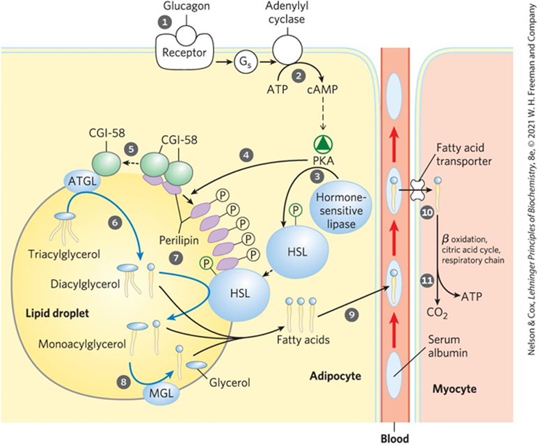 ② PKA가 perilipin, HSL 인산화 → perilipin에서 CGI-58 유리